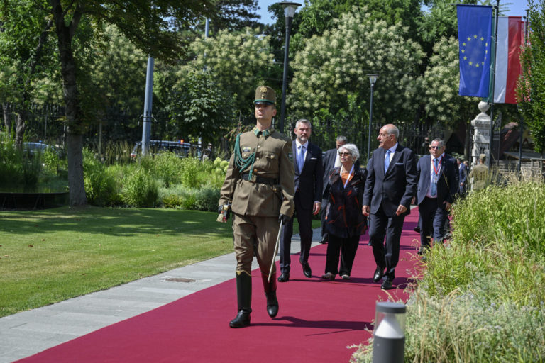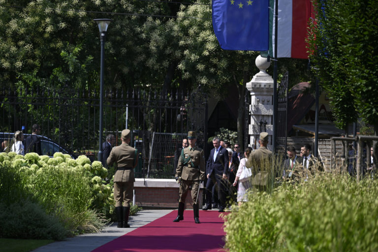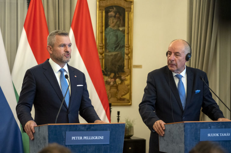 Zľava v popredí: Slovenský prezident Peter Pellegrini  a maďarský prezident Tamás Sulyok počas oficiálnej návštevy prezidenta SR v Budapešti. Budapešť, 18. júl 2024. Foto: SITA/Milan Illík