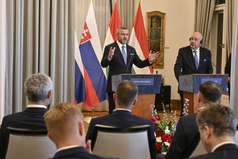 Zľava: Slovenský prezident Peter Pellegrini a maďarský prezident Tamás Sulyok počas tlačového vyhlásenia v rámci oficiálnej návštevy prezidenta SR v Budapešti. Budapešť, 18. júl 2024. Foto: SITA/Milan Illík