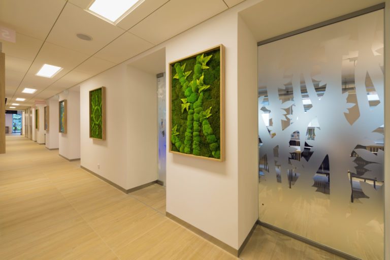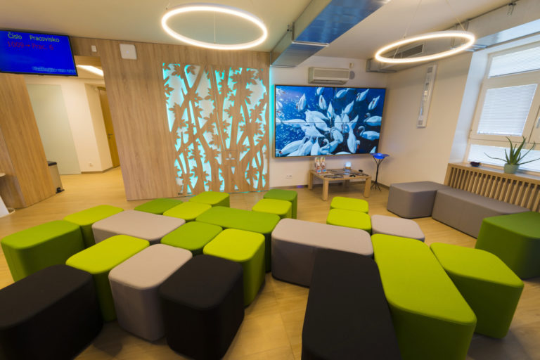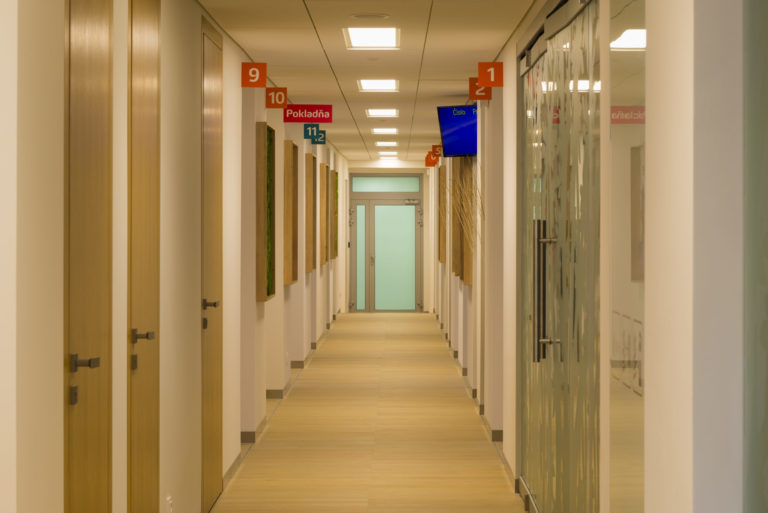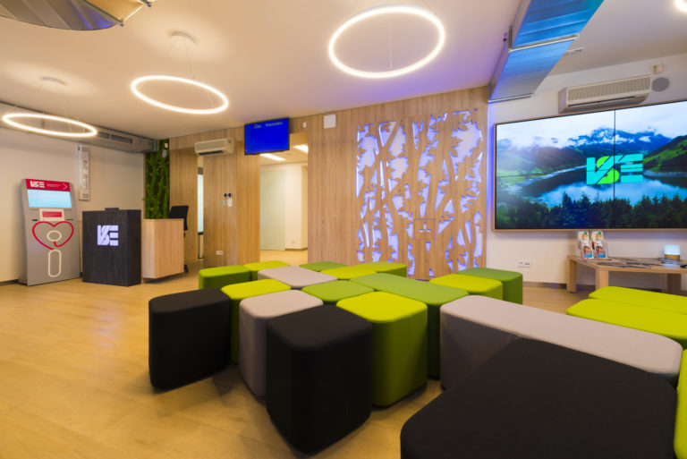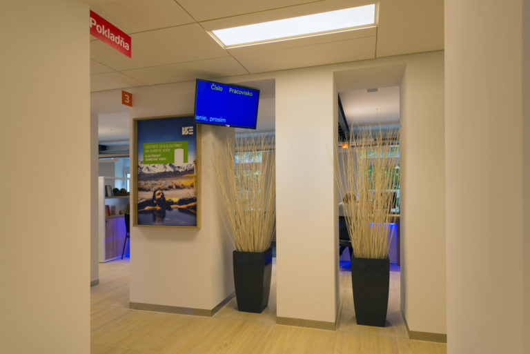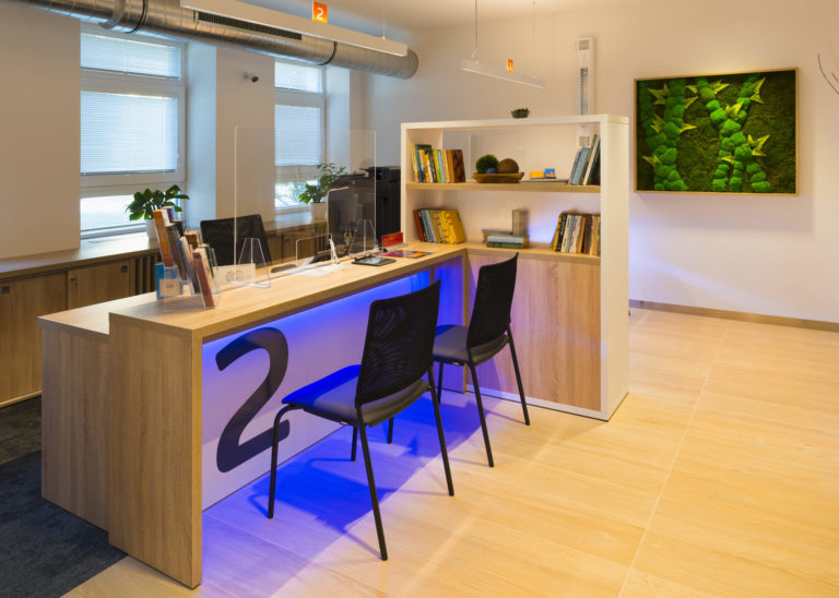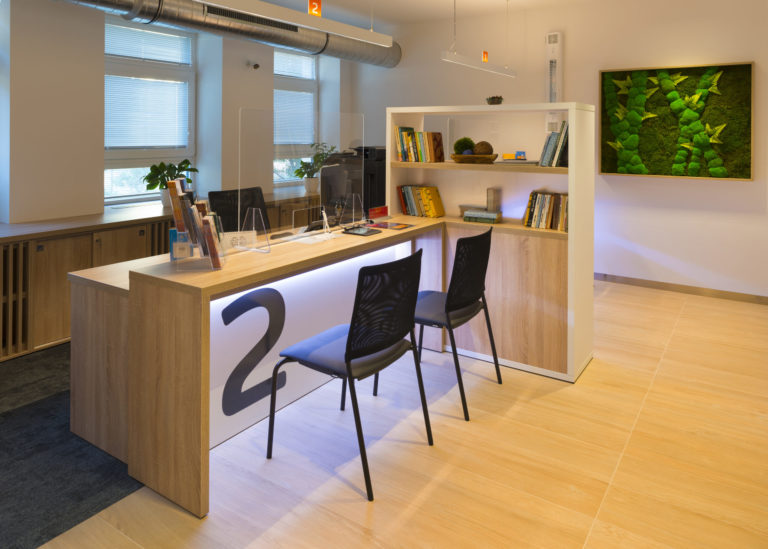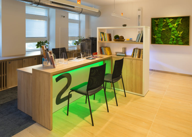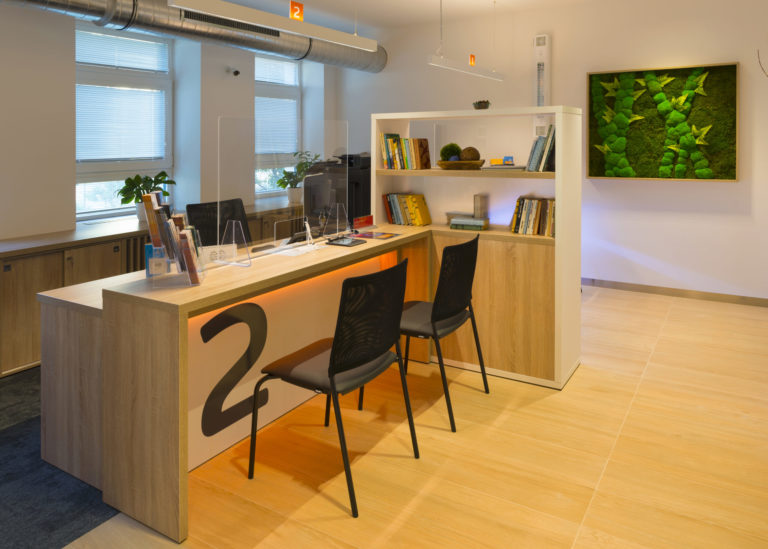 Obsluha zákazníkov sa realizuje na pracoviskách, pre ktoré je charakteristický jednoduchý a funkčný nábytok, samozrejme, otvorený presvetlený priestor a opäť kombinácia bielej a prírodných materiálov.