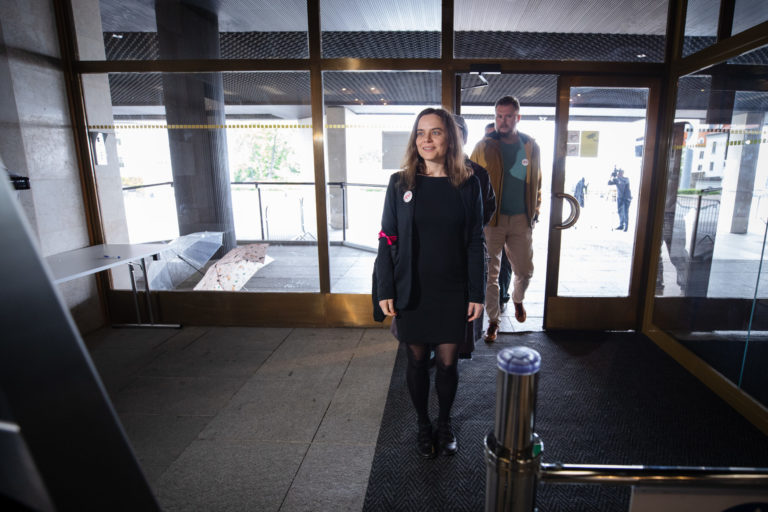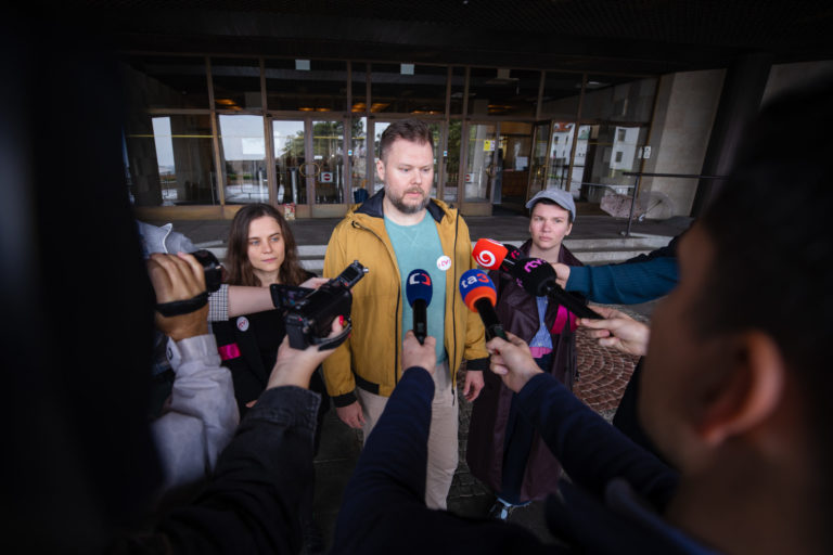 Zľava: Zástupcovia Koordinačného výboru iniciatívy zamestnancov Rozhlasu a televízie Slovenska (RTVS) za verejnoprávnosť a nezávislosť Tomáš Bartoněk, Rozália Vlasková a Paula Maľárová po odovzdaní otvoreného listu v podateľni Národnej rady SR poslancom Národnej rady SR s výzvou, aby nepodporili návrh zákona o Slovenskej televízii a rozhlase (STVR). Bratislava, 3. máj 2024. Foto: SITA/Diana Černak.