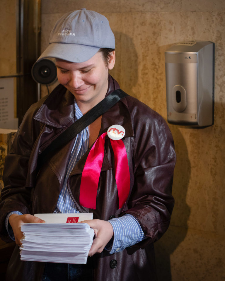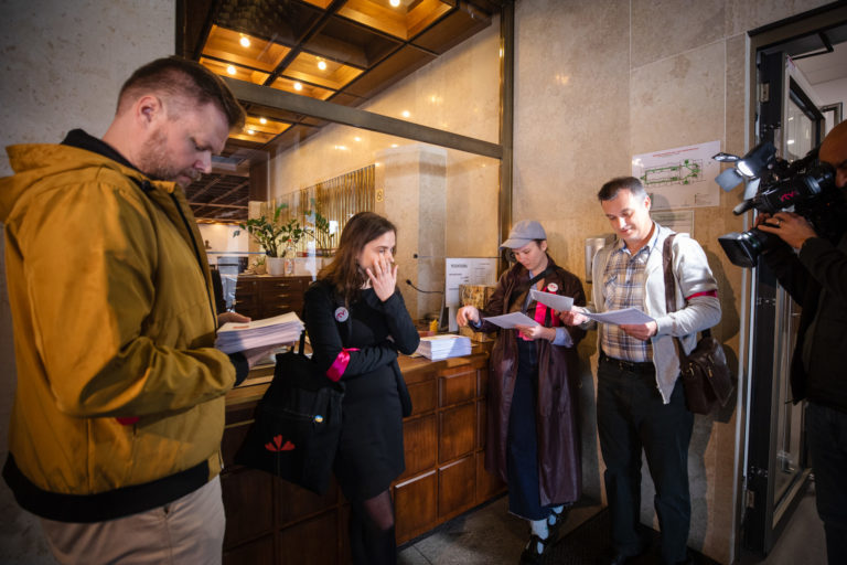 Odovzdávanie otvoreného listu zástupcami Koordinačného výboru iniciatívy zamestnancov Rozhlasu a televízie Slovenska (RTVS) za verejnoprávnosť a nezávislosť v podateľni NR SR poslancom Národnej rady SR s výzvou, aby nepodporili návrh zákona o Slovenskej televízii a rozhlase (STVR). Bratislava, 3. máj 2024. Foto: SITA/Diana Černak.