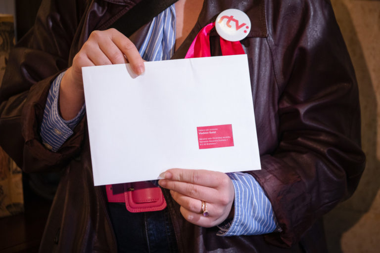 Odznak RTVS počas odovzdania otvoreného listu zástupcami Koordinačného výboru iniciatívy zamestnancov Rozhlasu a televízie Slovenska (RTVS) za verejnoprávnosť a nezávislosť v podateľni NR SR poslancom Národnej rady SR s výzvou, aby nepodporili návrh zákona o Slovenskej televízii a rozhlase (STVR). Bratislava, 3. máj 2024. Foto: SITA/Diana Černak.