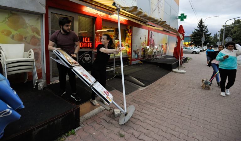Bezpečnostné opatrenia v zmrzlinárni počas prudkého vetra, ktorý sa dnes prehnal západným Slovenskom. Stará Turá, 14. september 2017. Foto: SITA/Martin Medňanský