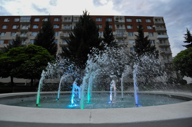 Pohľad na fontánu v silnom vetre, ktorý sa dnes prehnal západným Slovenskom. Stará Turá, 14. september 2017. Foto: SITA/Martin Medňanský