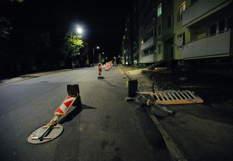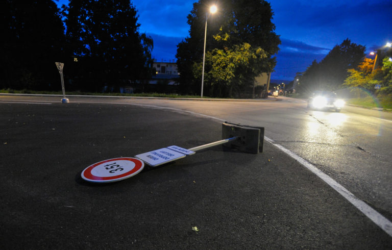 Pohľad na dopravné značenie spadnuté následkom silného vetra, ktorý sa dnes prehnal západným Slovenskom. Stará Turá, 14. september 2017. Foto: SITA/Martin Medňanský