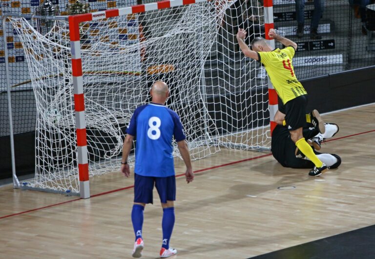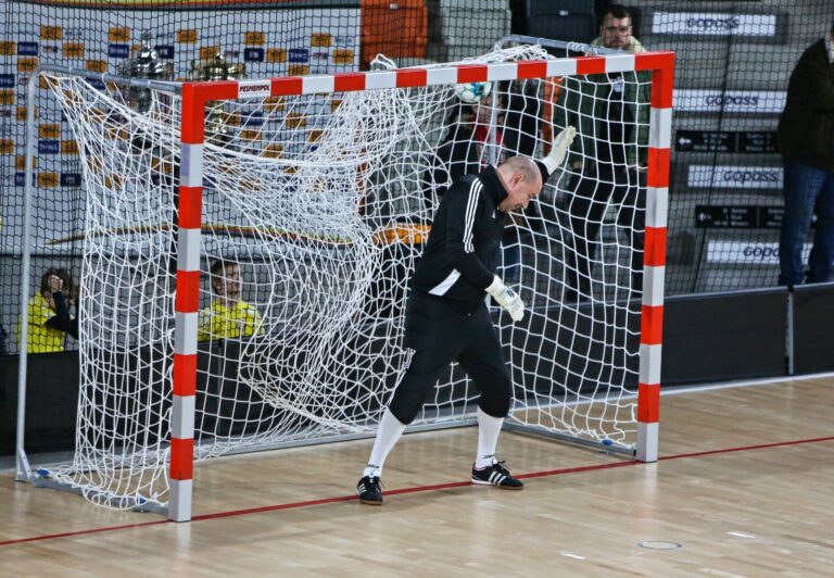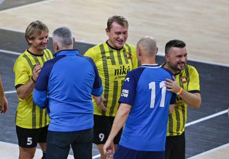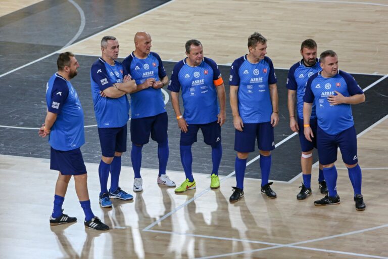 Minister športu SR Dušan Keketi dostáva gól z pokutového kopu v rámci futbalového zápasu legiend slovenského futbalu - bývalí hráči FK Inter Bratislava - Internacionáli Slovensko v rámci Dňa Interu. Gopass Aréna. Bratislava 1. december 2024. Foto: SITA/Tomáš Susko