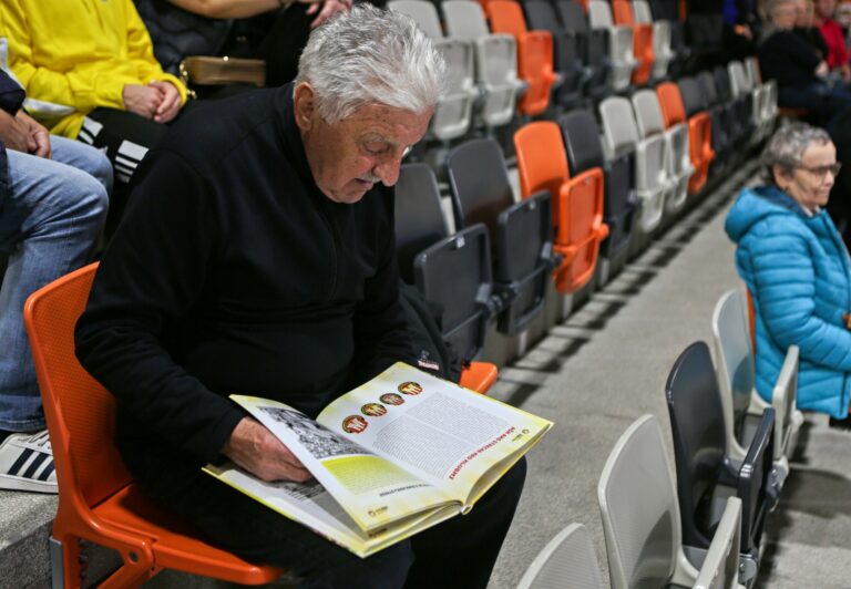 Fanúšik FK Inter Bratislava si prezerá knihu"My sme tí žlto-čierni" v rámci futbalového zápasu legiend slovenského futbalu - bývalí hráči FK Inter Bratislava - Internacionáli Slovensko v rámci Dňa Interu. Gopass Aréna. Bratislava 1. december 2024. Foto: SITA/Tomáš Susko