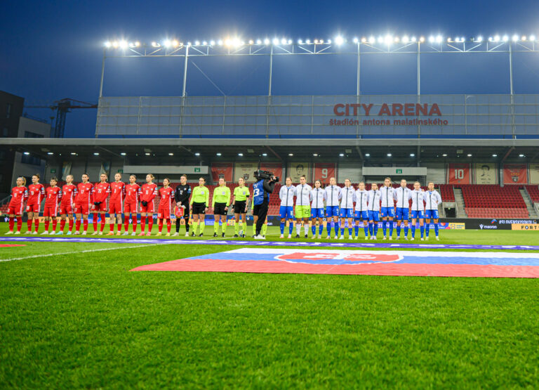 Zľava: Reprezentácia Moldavska a Slovenska pred začatím futbalového zápasu Ligy národov žien 2025 v 1. skupine C-divízie medzi Slovensko - Moldavsko. Trnava, 25. február 2025. Foto: SITA/Martin Havran