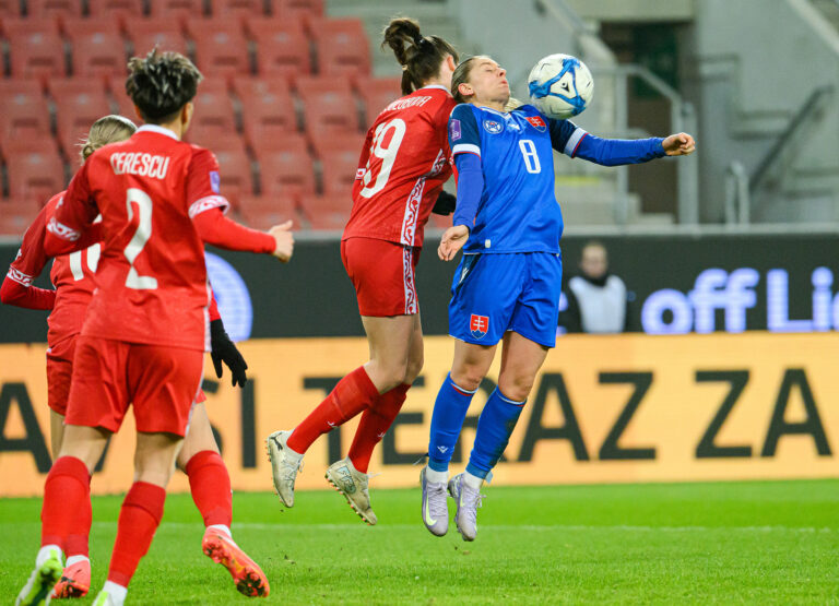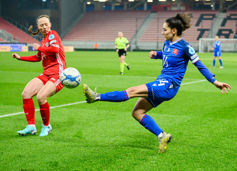 Karolína Bayerová zo Slovenska (vpravo) počas futbalového zápasu Ligy národov žien 2025 v 1. skupine C-divízie medzi Slovensko - Moldavsko. Trnava, 25. február 2025. Foto: SITA/Martin Havran