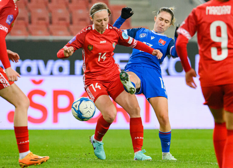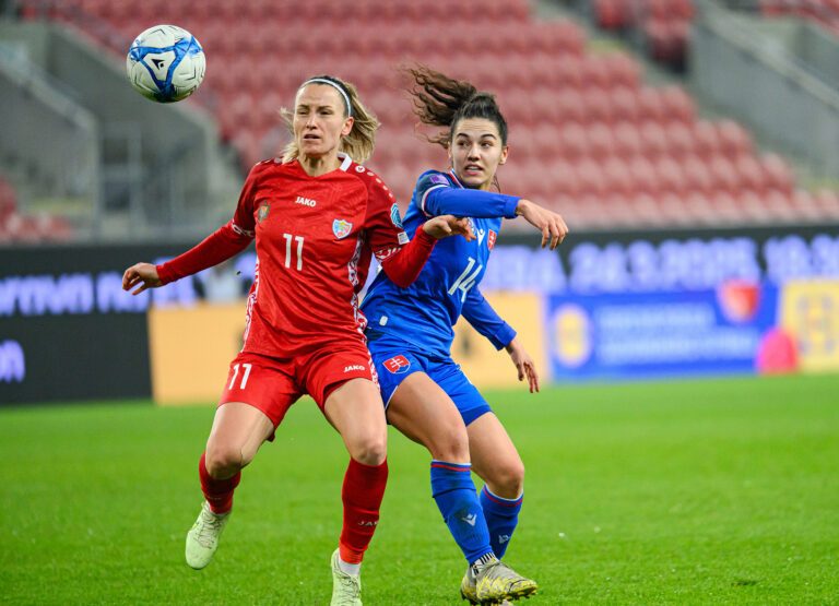 Sprava: Klaudia Fabová zo Slovenska a Anastasia Sivolobova z Moldavska počas futbalového zápasu Ligy národov žien 2025 v 1. skupine C-divízie medzi Slovensko - Moldavsko. Trnava, 25. február 2025. Foto: SITA/Martin Havran