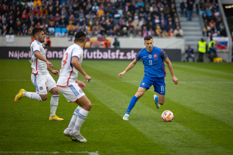 Slovenský reprezentant László Bénes počas prípravného medzištátneho futbalového zápasu proti Čile. Bratislava, 20. november 2022. Foto: SITA/Jana Birošová.