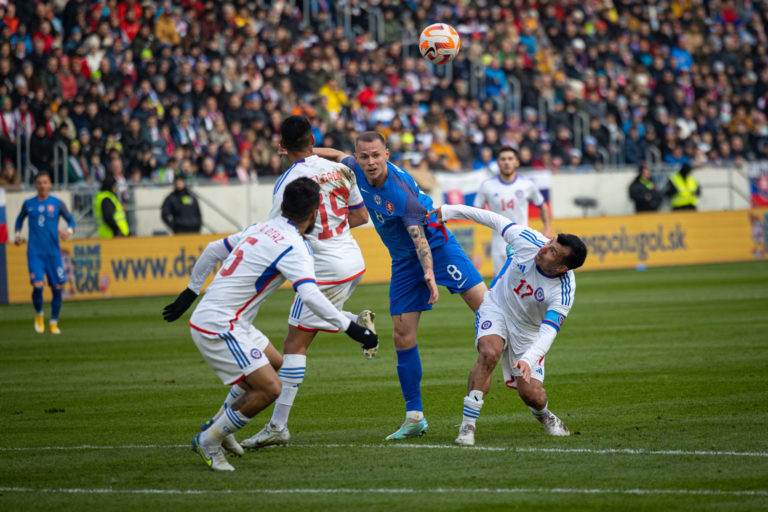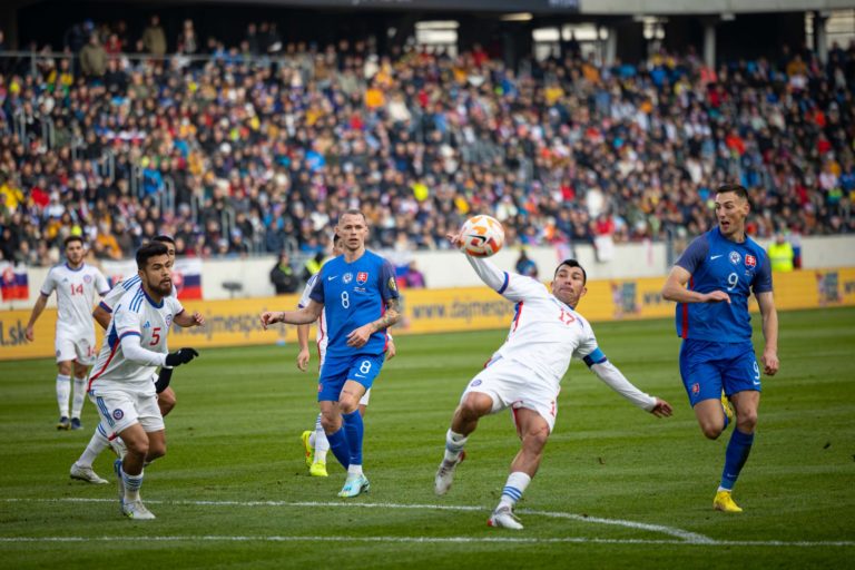 Róbert Boženík (9) a Ondrej Duda (8) sledujú ako Gary Mendel odkopáva loptu počas prípravného medzištátneho futbalového zápasu medzi Slovensko a Čile. Bratislava, 20. november 2022. Foto: SITA/Jana Birošová.
