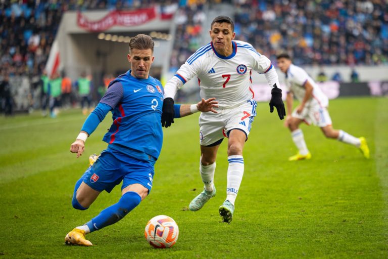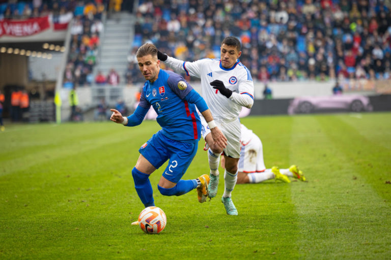 Peter Pekarík v súboji s Alexisom Sánchezom prípravného medzištátneho futbalového zápasu medzi Slovenskom a Čile. Bratislava, 20. november 2022. Foto: SITA/Jana Birošová.