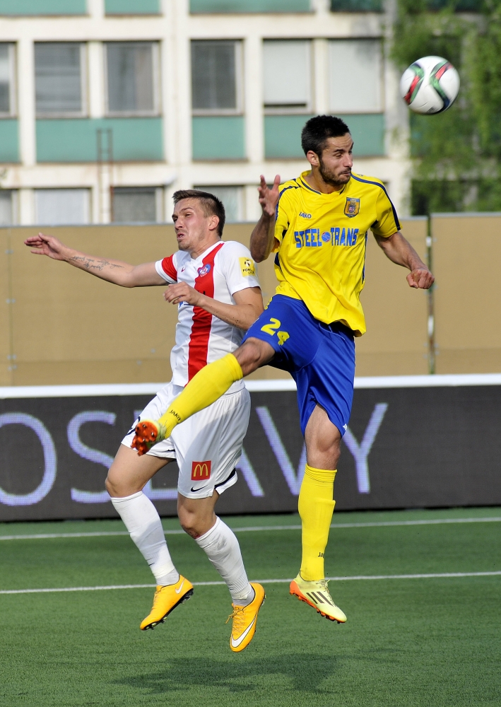 Márius Charizopulos z FC Vion Zlaté Moravce (vpravo) a Patrik Vajda z FK Dukla Banská Bystrica (vľavo) počas 28. kola futbalovej Fortuna ligy medzi FC Vion Zlaté Moravce – FK Dukla Banská Bystrica. Zlaté Moravce, 5. máj 2015. Foto: SITA/Martin Havran