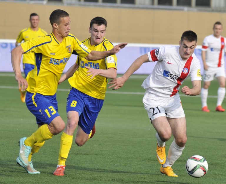 Róbert Polievka z FK Dukla Banská Bystrica (vpredu) počas 28. kola futbalovej Fortuna ligy medzi FC Vion Zlaté Moravce – FK Dukla Banská Bystrica. Zlaté Moravce, 5. máj 2015. Foto: SITA/Martin Havran