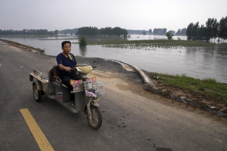 Dedinčania sa rozprávajú pri pohľade na rozvodnenú rieku, ktorá zaplavuje úrodu v dedine v Langfang v čínskej provincii Hebei. Foto: SITA/AP