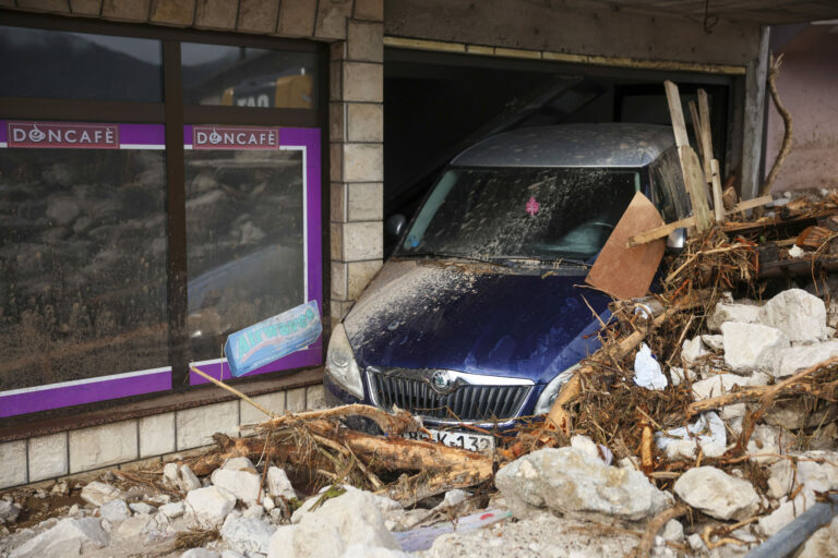 Pohľad na auto a zničenú dedinu Jablanicu po záplavách, ktoré spôsobili silné dažde v Bosne a Hercegovine. Foto: SITA/AP.
