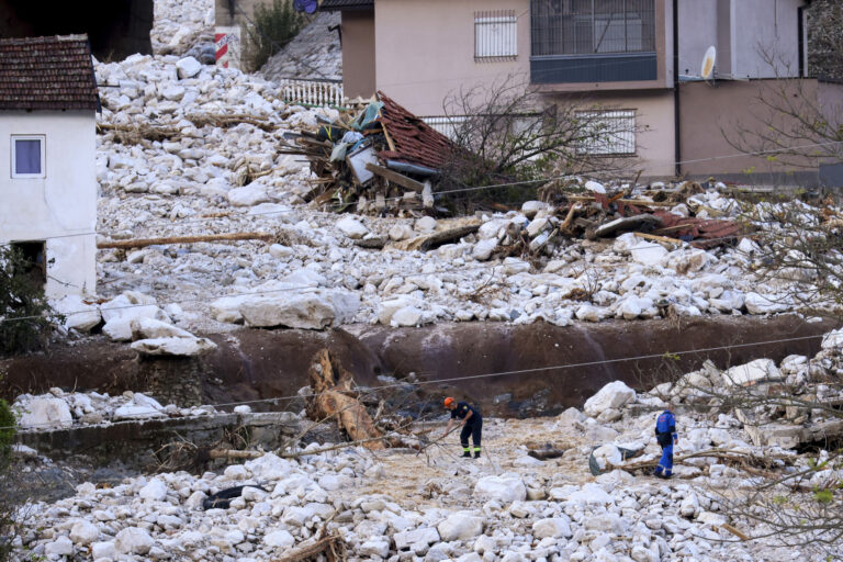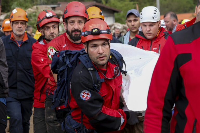 Záchranári prehľadávajú dedinu Jablanicu, či nenájdu nezvestných po záplavách, ktoré zasiahli Bosnu a Hercegovine. Foto: SITA/AP.