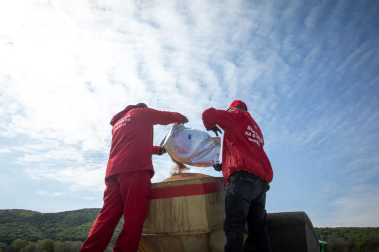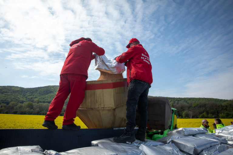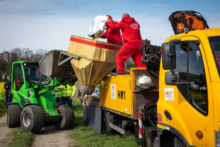 Muži sypú larvicíd BTI, ktorý aplikovali počas špeciálneho zásahu z helikoptéry pozdĺž rieky Moravy v území Devínskej Novej Vsi v Bratislave. Bratislava, 27. apríl 2023. Foto: SITA/Diana Černáková