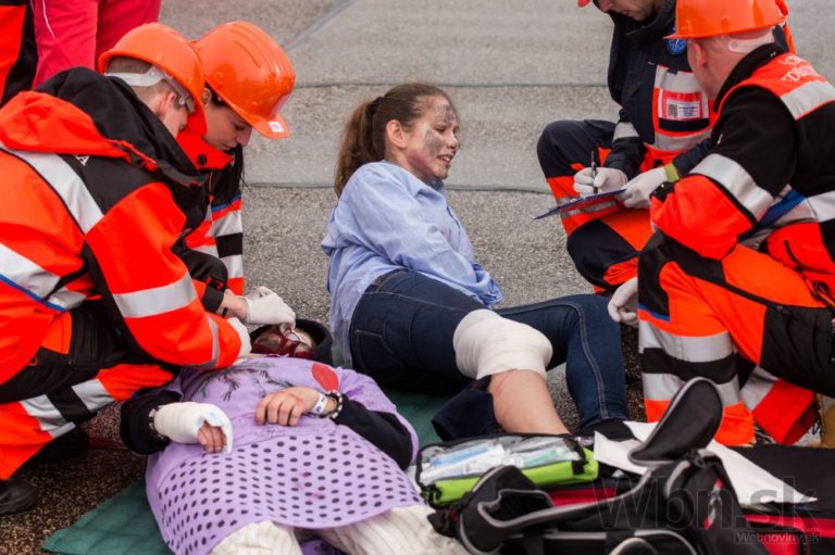 Pohľad na cvičenie zložiek integrovaného záchranného systému (hasiči, rýchla zdravotná služba, polícia) na Letisku M. R. Štefánika, kde bola nasimulovaná letecká nehoda so 189 cestujúcimi.