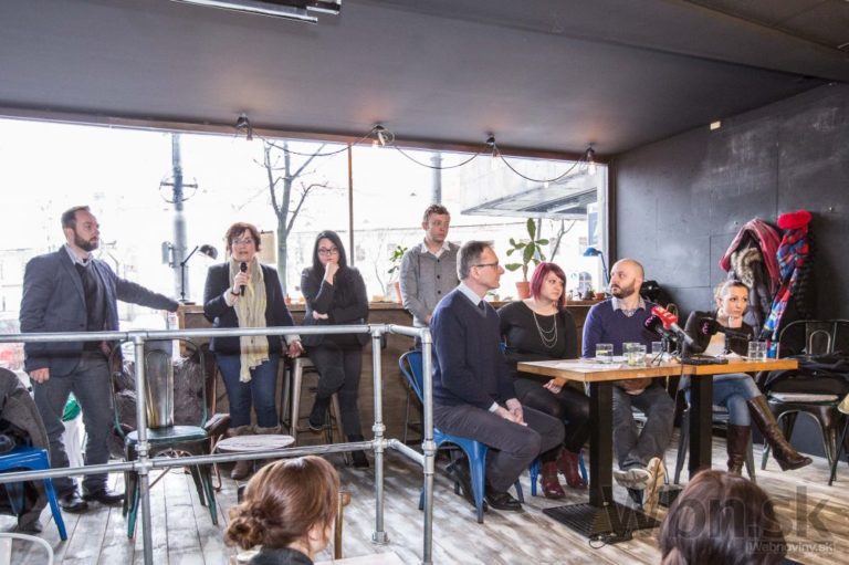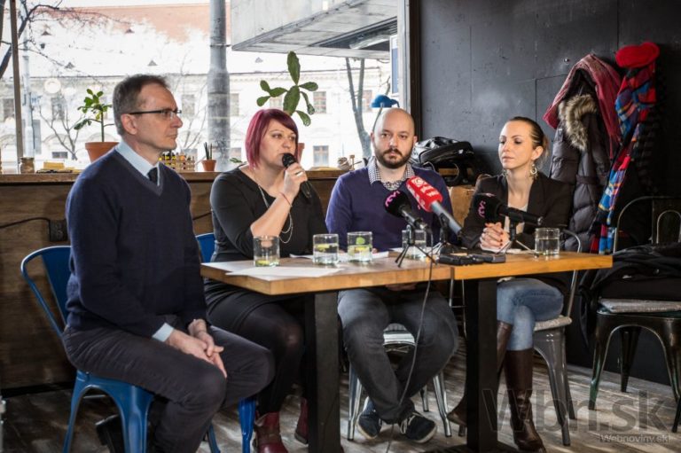 Zľava v pozadí: Riaditeľ Nadácie otvorenej Spoločnosti Marek Kapusta, riaditeľka Amnesty International Slovensko Jana Malovičová, spoluzakladateľka Queer Leaders Forum Romana Schlesinger a Andrej Kuruc z iniciatívy No Mantinels počas TB Iniciatívy Inakosť, kde vyjadrili postoj k februárovému referendu o ochrane rodiny. Bratislava, 29. január 2015. Foto: SITA/Katarína Acél - Gáliková