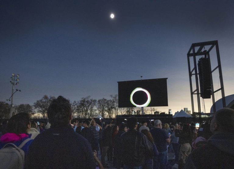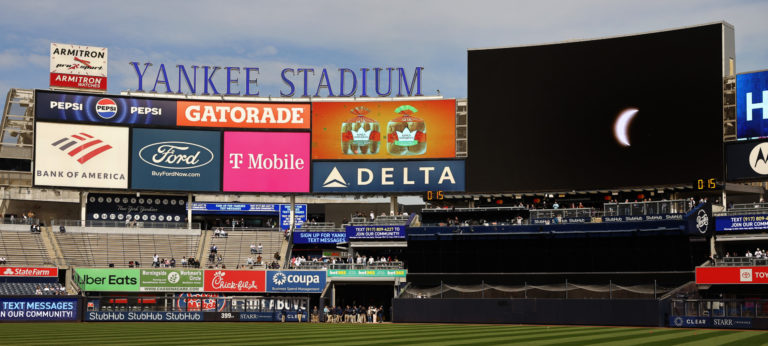 Diváci sledujú úplné zatmenie Slnka zo štadióna Yankee v pondelok 8. apríla 2024. Foto: SITA/AP