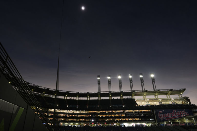 Úplné zatmenia Slnka nad štadiónom Progressive Field v Clevelande v pondelok 8. apríla 2024. Foto: SITA/AP