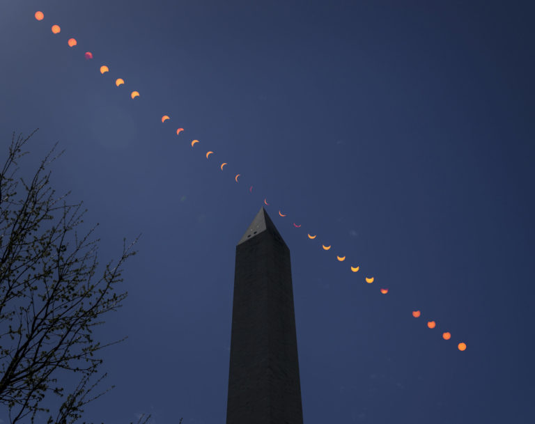 Kompozitná snímka z viacerých expozícií ukazuje priebeh čiastočného zatmenia Slnka nad Washingtonským monumentom v pondelok 8. apríla 2024. Foto: Bill Ingalls/NASA via AP