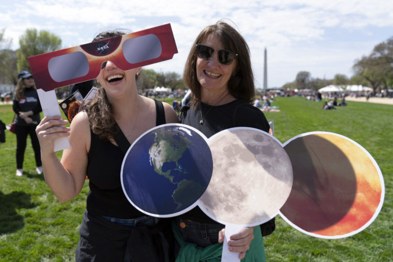 Mackenzie Trumbullová (vľavo) a Kathy Trumbullová pri sledovaní úplného zatmenia Slnka pri pohľade z National Mall vo Washingtone v pondelok 8. apríla 2024. Foto: SITA/AP