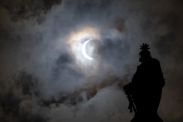 Socha slobody na vrchole Kapitolu, keď Mesiac čiastočne zakrýva Slnko počas úplného zatmenia Slnka. Foto: SITA/AP