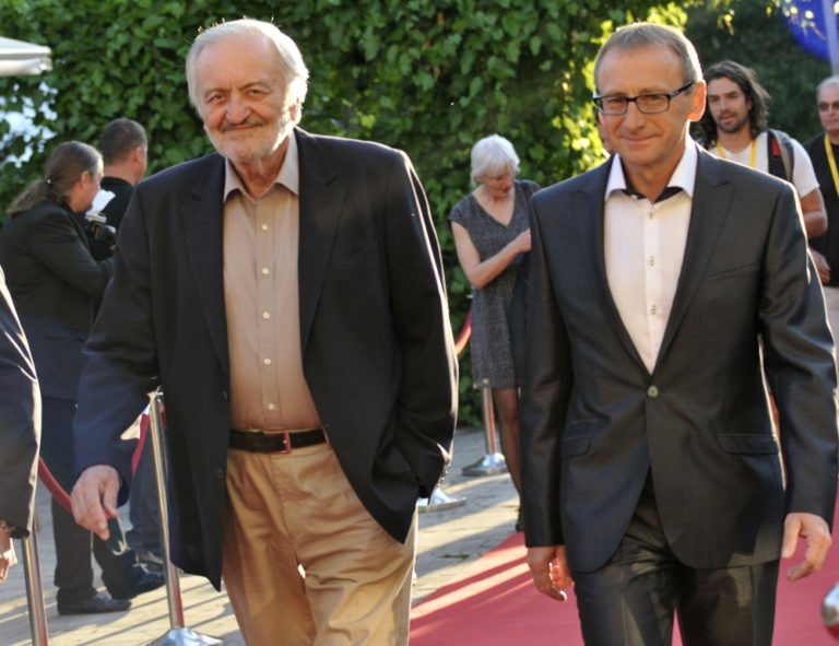 Prezident Art Film Festu 2014 Milan Lasica (vľavo) a riaditeľ festivalu Peter Nágel prichádzajú na záverečný ceremoniál 22. ročníka medzinárodného filmového festivalu Art Film Fest 2014. Trenčianske Teplice, 27. jún 2014. Foto: SITA/Tomáš Somr