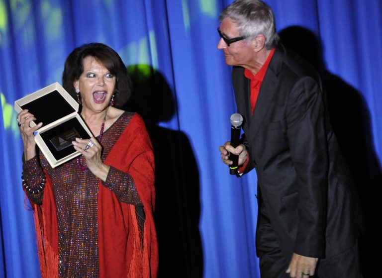 Laureátka ceny Hercova misia talianska herečka Claudia Cardinale (vľavo) preberajúc kryštálovú kópiu tabuľky s vlastným menom a viceprezident festivalu a riaditeľ ceny Hercova misia a Zlatá kamera Peter Hledík počas záverečného ceremoniálu 22. ročníka medzinárodného filmového festivalu Art Film Fest 2014. Trenčianske Teplice, 27. jún 2014. Foto: SITA/Tomáš Somr