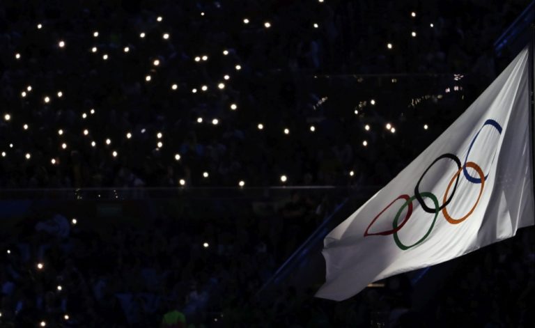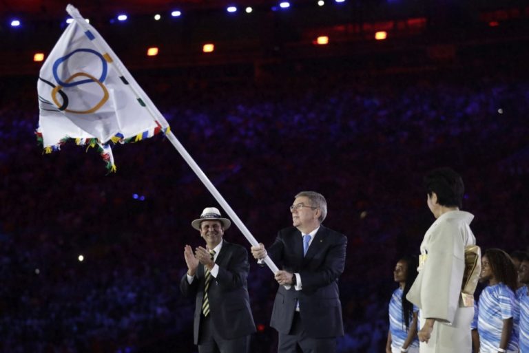 Prezident Medzinárodného olympijského výboru (MOV) Thomas Bach s olympijskou vlajkou počas záverečného ceremoniálu. Rio de Janeiro, 21. august 2016. Foto: SITA/AP