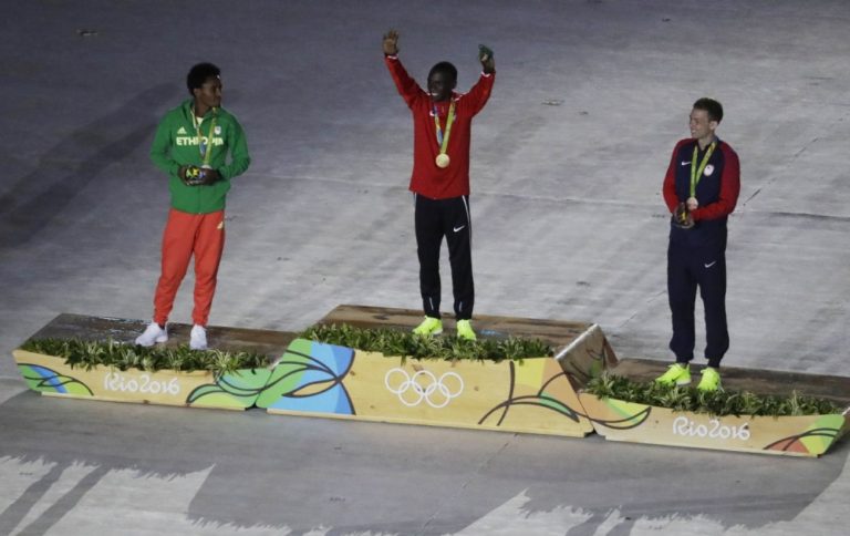 Na záverečnom ceremoniáli odovzdali aj posledné sady medailí, a to trom najlepším maratóncom - na stupne pre víťazov sa postavili bronzový Američan Galen Rupp, strieborný Etiópčan Feyisa Lilesa a zlatý Keňan Eliud Kipchoge.. Rio de Janeiro, 22. august 2016. Foto: SITA/AP