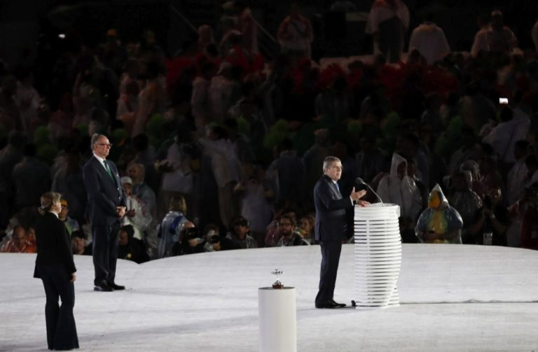 Prezident Medzinárodného olympijského výboru Thomas Bach počas svojho príhovoru na záverečnom ceremoniáli vyslovil tradičnú formulku a ukončil Hry XXXI. olympiády. Rio de Janeiro, 21. august 2016. Foto: SITA/AP
