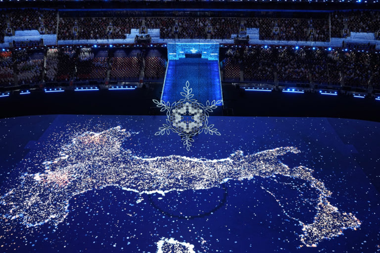 Obrázok Talianska, hostiteľa Zimných olympijských hier v roku 2026, počas záverečného ceremoniálu Zimných olympijských hier v roku 2022. Foto: AP Photo/Jeff Roberson