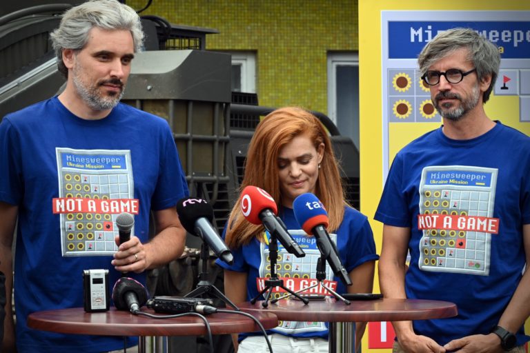 Zľava: Organizátor zbierky na odmínovacie zariadenie Božena 5 Dodo Dobrík, Zuzana Izsáková z iniciatívy Mier Ukrajine a Marián Kulich z iniciatívy Mier Ukrajine počas tlačovej besedy na tému: Zbierka na Boženu dosiahla dôležitý míľnik - slovenský odmínovač pre Ukrajinu ide do výroby v sídle výrobcu Way industries v Krupine. Krupina, 4. júl 2023. Foto: SITA/Jakub Julény