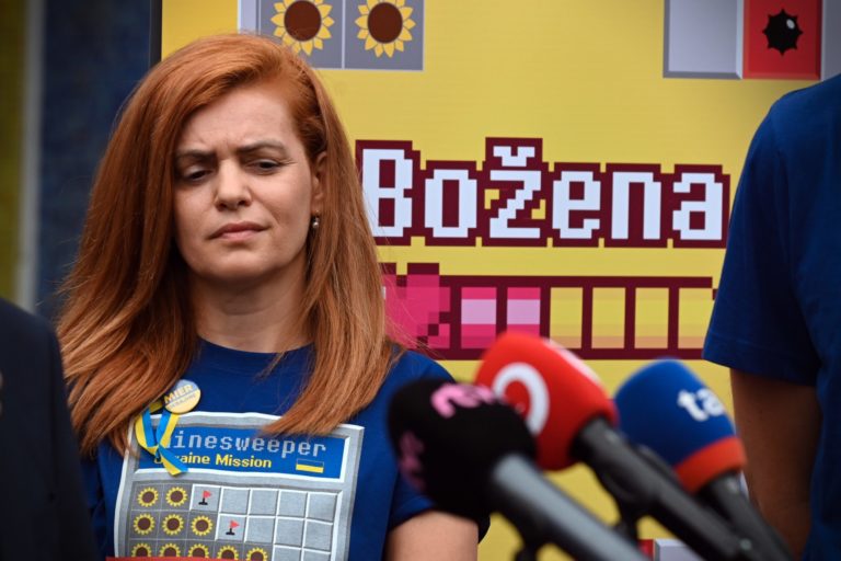 Zuzana Izsáková z iniciatívy Mier Ukrajine počas tlačovej besedy na tému: Zbierka na Boženu dosiahla dôležitý míľnik - slovenský odmínovač pre Ukrajinu ide do výroby v sídle výrobcu Way industries v Krupine. Krupina, 4. júl 2023. Foto: SITA/Jakub Julény