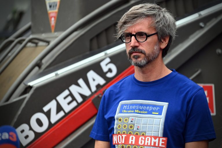 Marián Kulich z iniciatívy Mier Ukrajine počas tlačovej besedy na tému: Zbierka na Boženu dosiahla dôležitý míľnik - slovenský odmínovač pre Ukrajinu ide do výroby v sídle výrobcu Way industries v Krupine. Krupina, 4. júl 2023. Foto: SITA/Jakub Julény