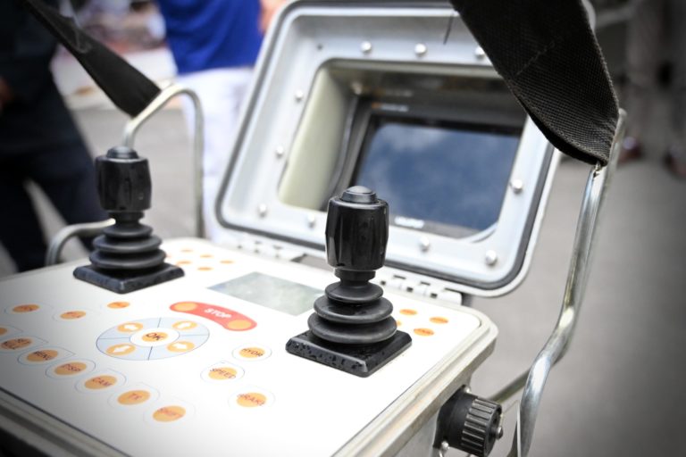 Diaľkové ovládanie odmínovacieho zariadenia Božena 5 počas tlačovej besedy iniciatívy Mier Ukrajine v sídle výrobcu Way industries v Krupine na tému: Zbierka na Boženu dosiahla dôležitý míľnik - slovenský odmínovač pre Ukrajinu ide do výroby. Krupina, 4. júl 2023. Foto: SITA/Jakub Julény