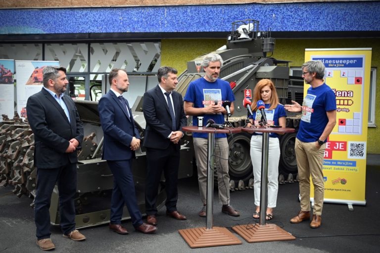 Odmínovacie zariadenie Božena 5 počas tlačovej besedy iniciatívy Mier Ukrajine v sídle výrobcu Way industries v Krupine na tému: Zbierka na Boženu dosiahla dôležitý míľnik - slovenský odmínovač pre Ukrajinu ide do výroby. Krupina, 4. júl 2023. Foto: SITA/Jakub Julény