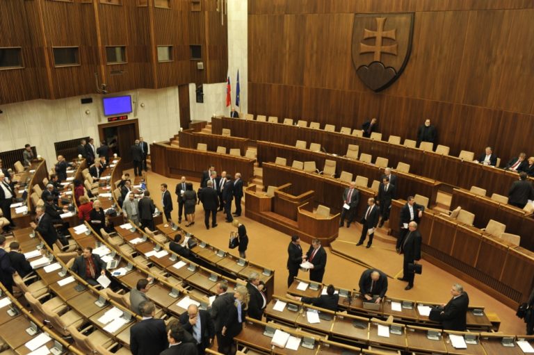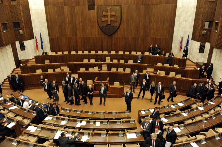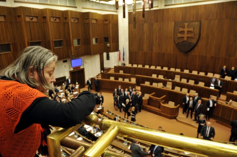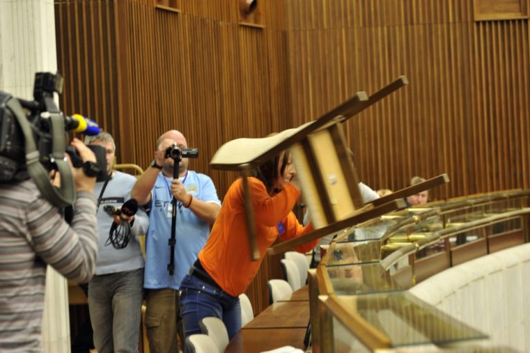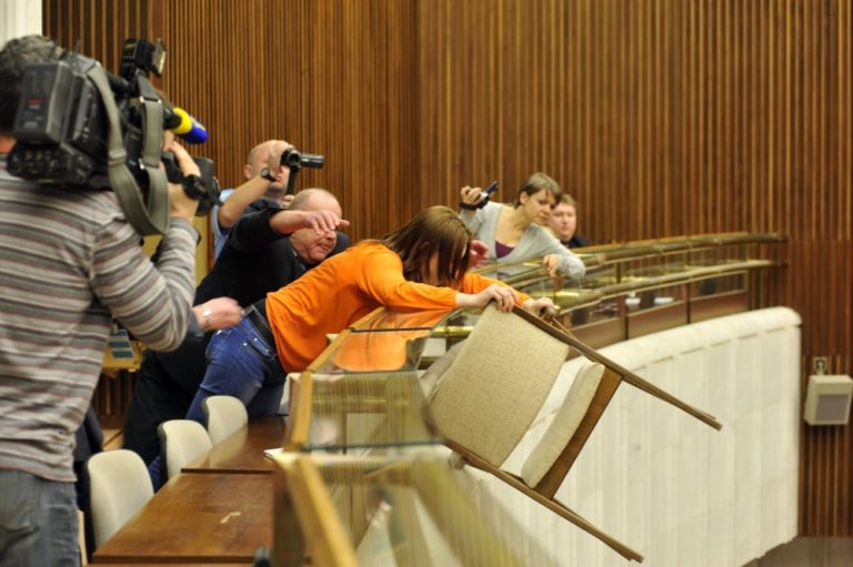 Situácia v rokovacej sále NR SR, počas incidentu na balkóne po skončení mimoriadnej schôdze parlamentu. Bratislava, 13. február 2014. Foto: SITA/Ján Slovák