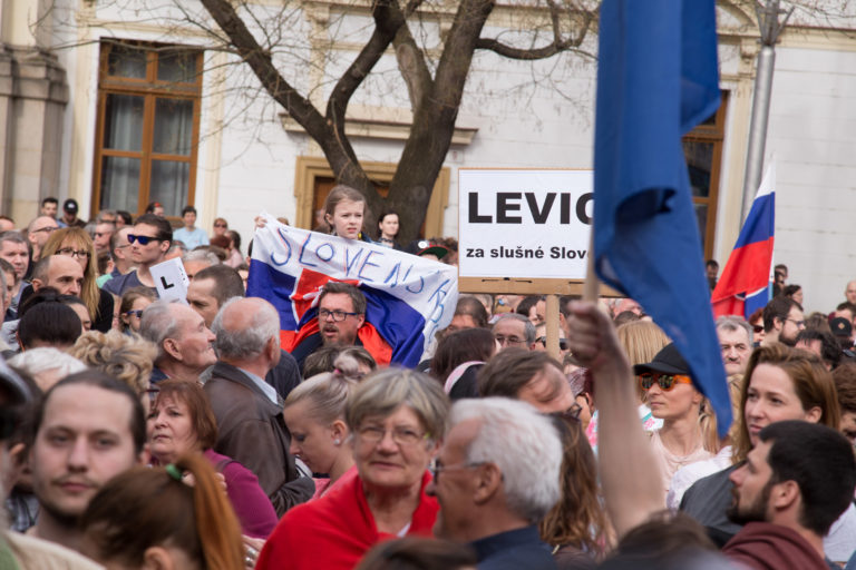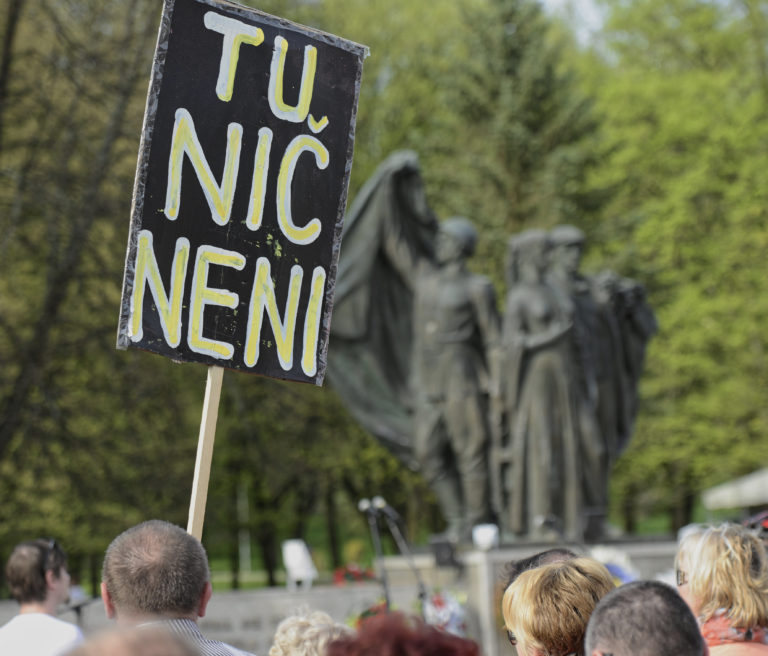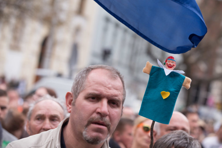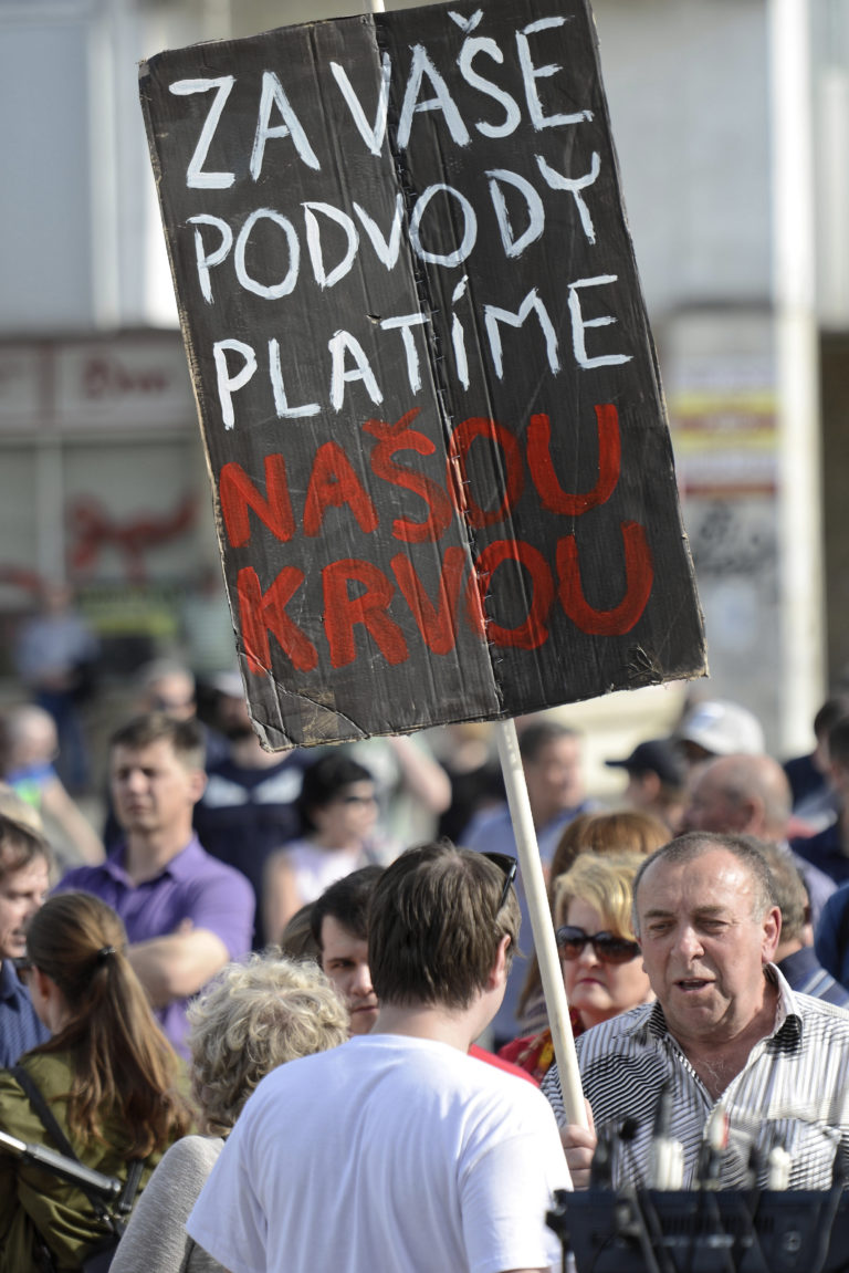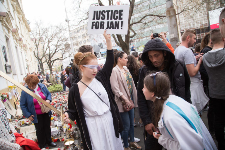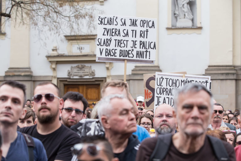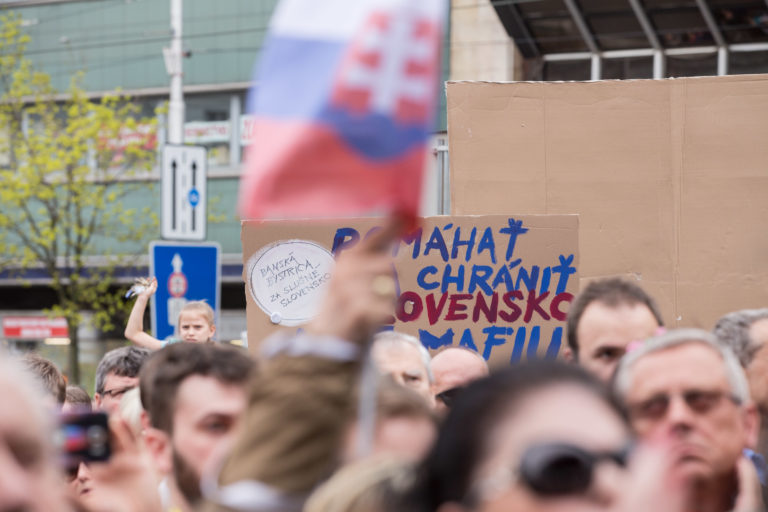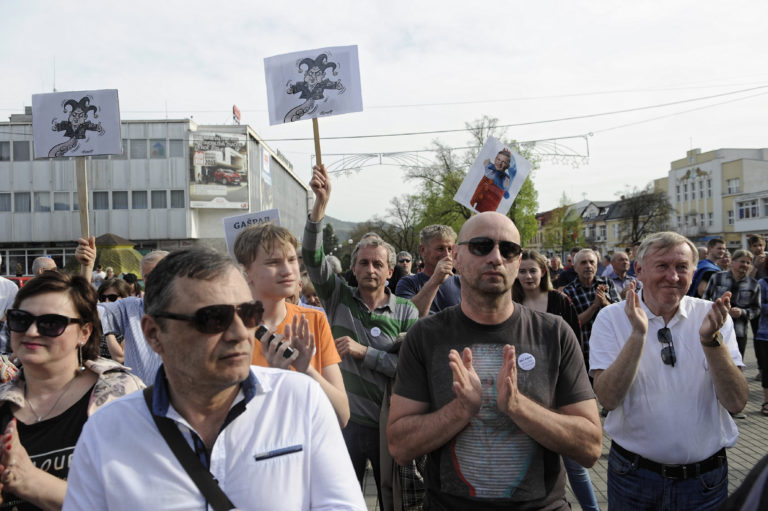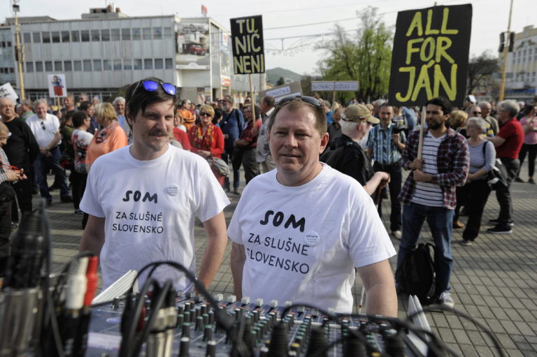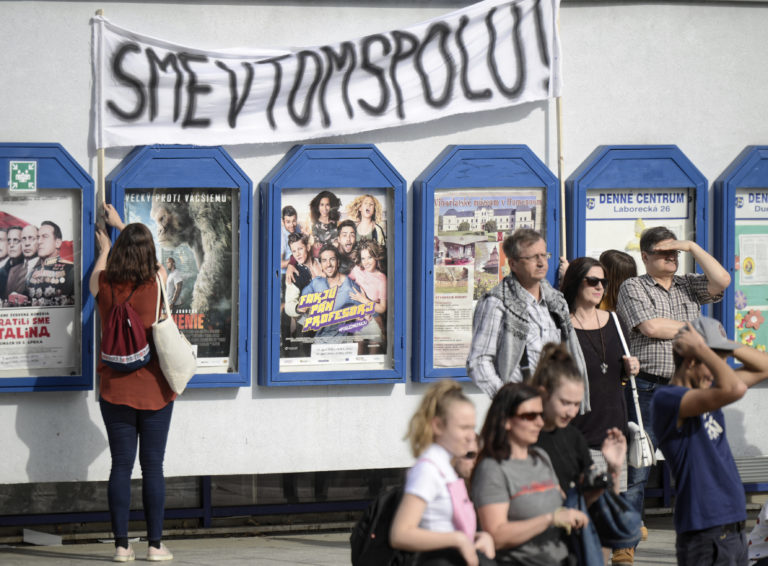 Transparenty počas občianskeho zhromaždenia Za slušné Slovensko, organizované v súvislosti s vývojom spoločenskej situácie po vražde novinára Jána Kuciaka a jeho snúbenice Martiny Kušnírovej, v Humennom. Humenné, 15. apríl 2018. Foto: SITA/Ivan Fleischer.