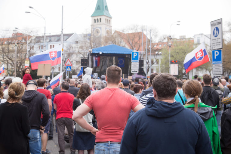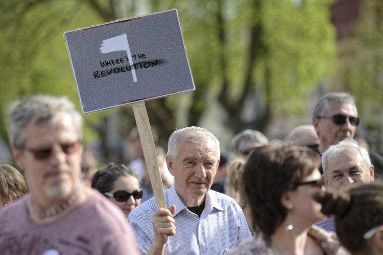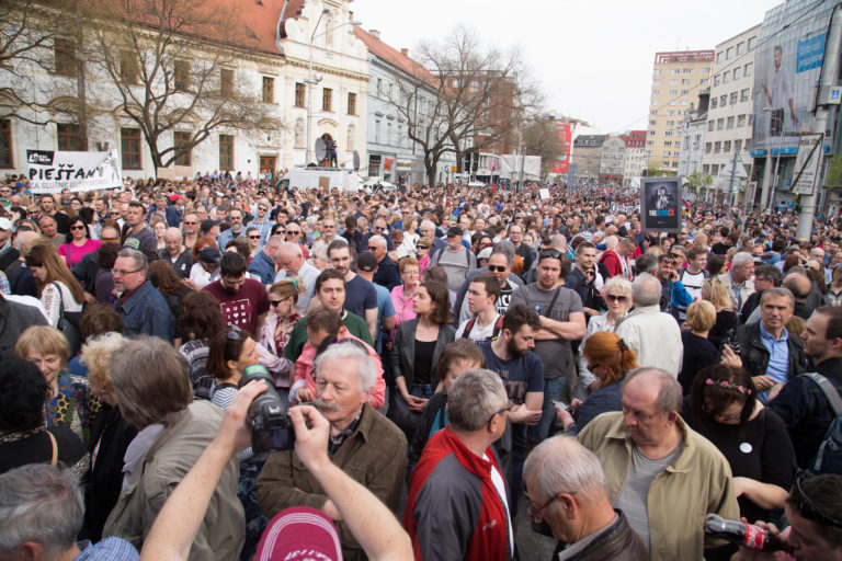 Účastníci občianskeho zhromaždenia Za slušné Slovensko, organizované v súvislosti s vývojom spoločenskej situácie po vražde novinára Jána Kuciaka a jeho snúbenice Martiny Kušnírovej, na Námestí SNP v Bratislave. Bratislava, 15. apríl 2018. Foto: SITA/Branislav Bibel.