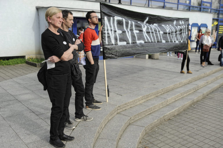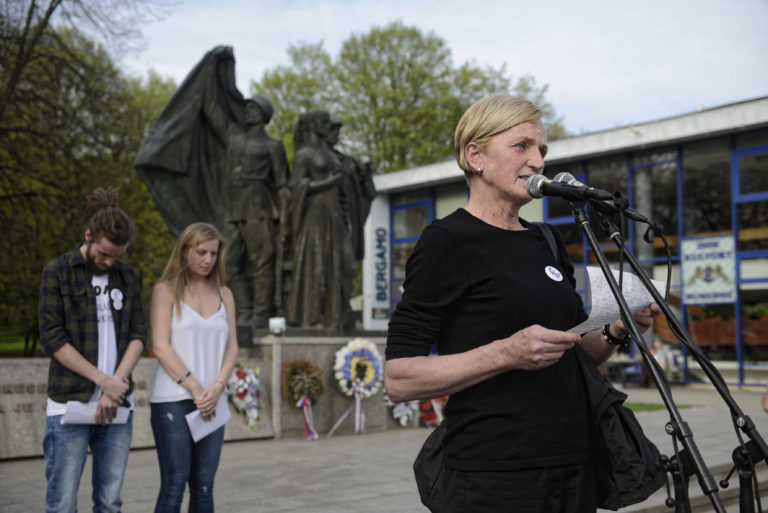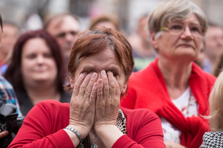 Zlatica Kušnírová, matka zavraždenej Martiny, (vľavo) počas občianskeho zhromaždenia Za slušné Slovensko, organizované v súvislosti s vývojom spoločenskej situácie po vražde novinára Jána Kuciaka a jeho snúbenice Martiny Kušnírovej, v Humennom. Humenné, 15. apríl 2018. Foto: SITA/Ivan Fleischer.