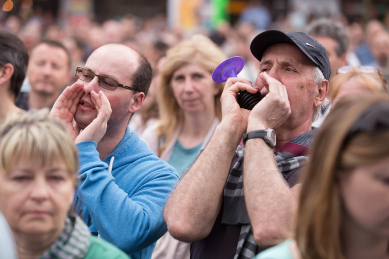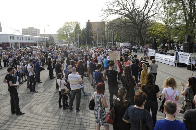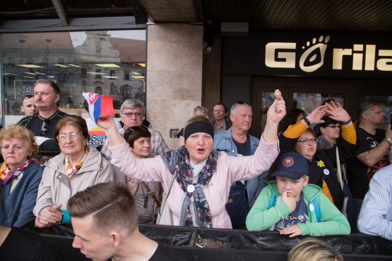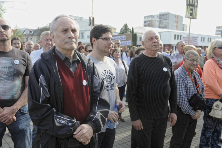 Účastníci občianskeho zhromaždenia Za slušné Slovensko, organizované v súvislosti s vývojom spoločenskej situácie po vražde novinára Jána Kuciaka a jeho snúbenice Martiny Kušnírovej, v Humennom. Humenné, 15. apríl 2018. Foto: SITA/Ivan Fleischer.