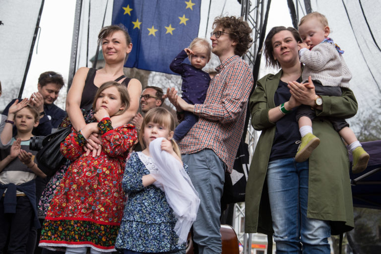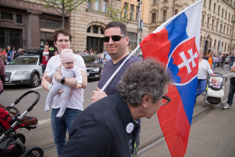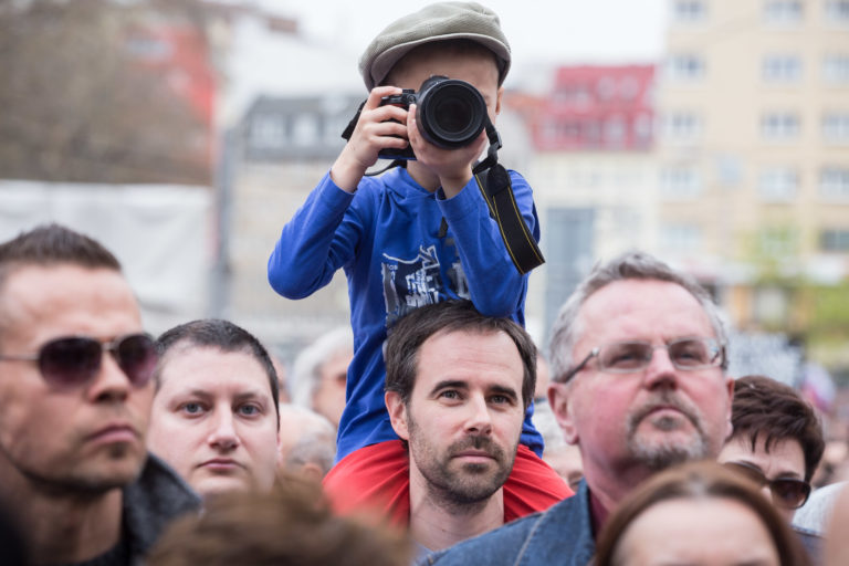 Rodičia s deťmi na pódiu počas občianskeho zhromaždenia Za slušné Slovensko, organizované v súvislosti s vývojom spoločenskej situácie po vražde novinára Jána Kuciaka a jeho snúbenice Martiny Kušnírovej, na Námestí SNP v Bratislave. Bratislava, 15. apríl 2018. Foto: SITA/Branislav Bibel.