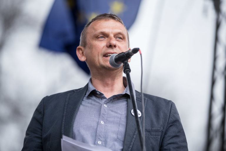 Právnik Pavol Žilinčík na pódiu počas občianskeho zhromaždenia Za slušné Slovensko, organizované v súvislosti s vývojom spoločenskej situácie po vražde novinára Jána Kuciaka a jeho snúbenice Martiny Kušnírovej, na Námestí SNP v Bratislave. Bratislava, 15. apríl 2018. Foto: SITA/Branislav Bibel.
