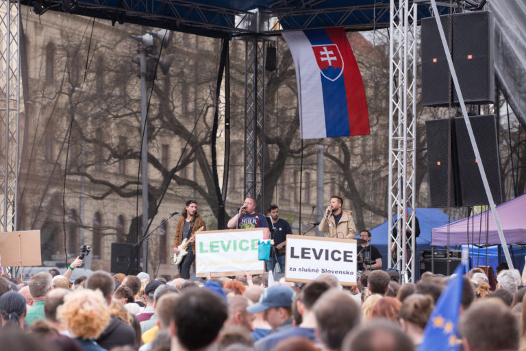 Koncert kapely Para počas občianskeho zhromaždenia Za slušné Slovensko, organizované v súvislosti s vývojom spoločenskej situácie po vražde novinára Jána Kuciaka a jeho snúbenice Martiny Kušnírovej, na Námestí SNP v Bratislave. Bratislava, 15. apríl 2018. Foto: SITA/Branislav Bibel.