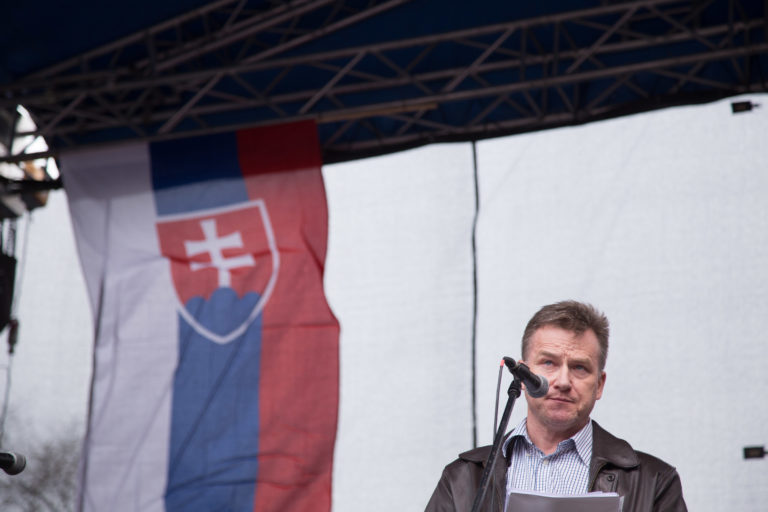 Poľnohospodár František Oravec na pódiu počas občianskeho zhromaždenia Za slušné Slovensko, organizované v súvislosti s vývojom spoločenskej situácie po vražde novinára Jána Kuciaka a jeho snúbenice Martiny Kušnírovej, na Námestí SNP v Bratislave. Bratislava, 15. apríl 2018. Foto: SITA/Branislav Bibel.